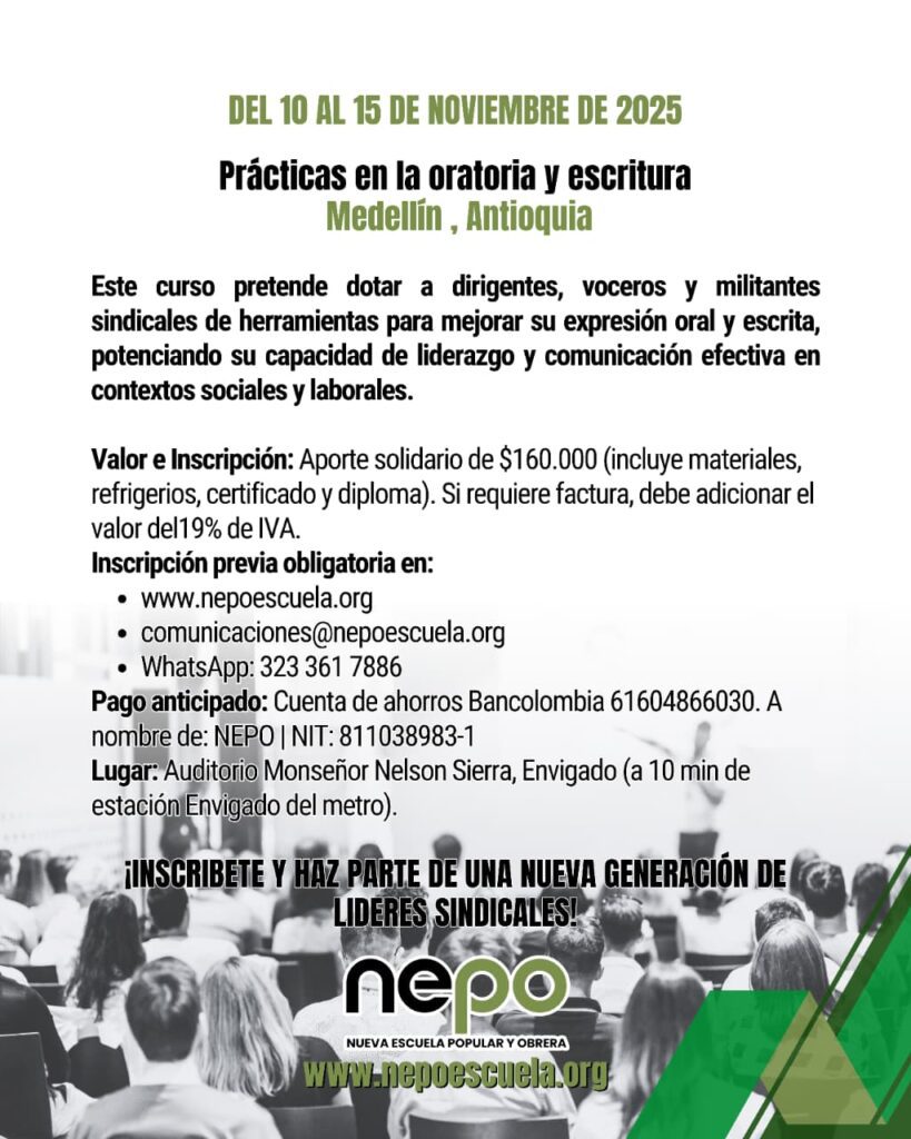 • Convocatoria: Prácticas en la Oratoria y la Escritura Sindical – Medellín, del 10 al 15 de Noviembre.